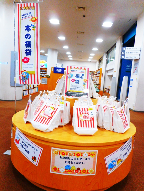 中野区立図書館全館で『本の2倍貸出キャンペーン』を行います。それにあわせて中野区立中央図書館では『本の福袋』をご用意しました。どんな本が入ってるかは開けてからのお楽しみ!ノベルティとしてしおりもプレゼント。ぜひご覧ください。